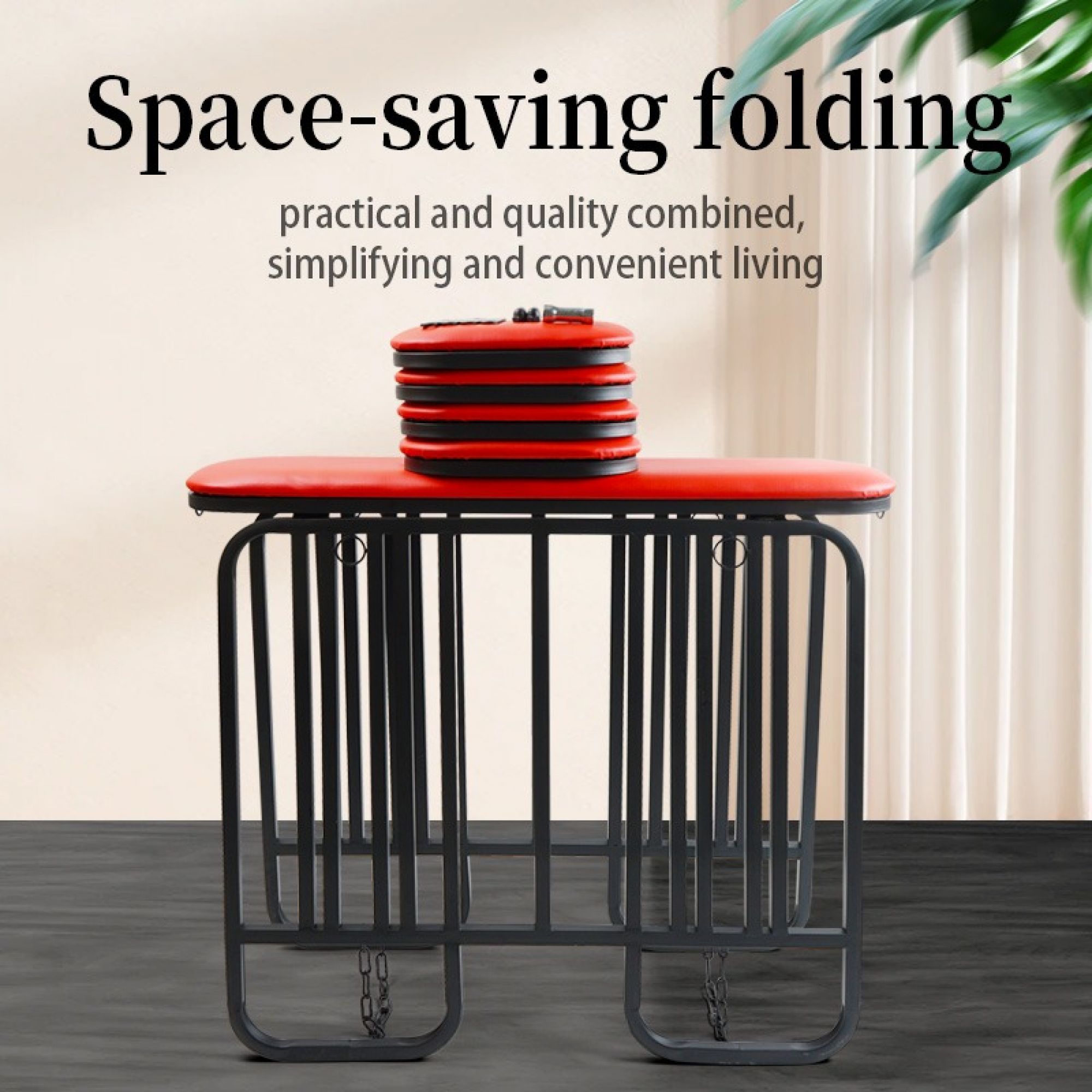 Elevate your intimate experiences with the Roomfun SM Fun Trestle Stool—a uniquely crafted piece designed for passion, comfort, and playful exploration. Built with durable black metal framing and luxuriously padded red faux leather cushions, this trestle stool offers optimal support for a variety of positions and fantasies.